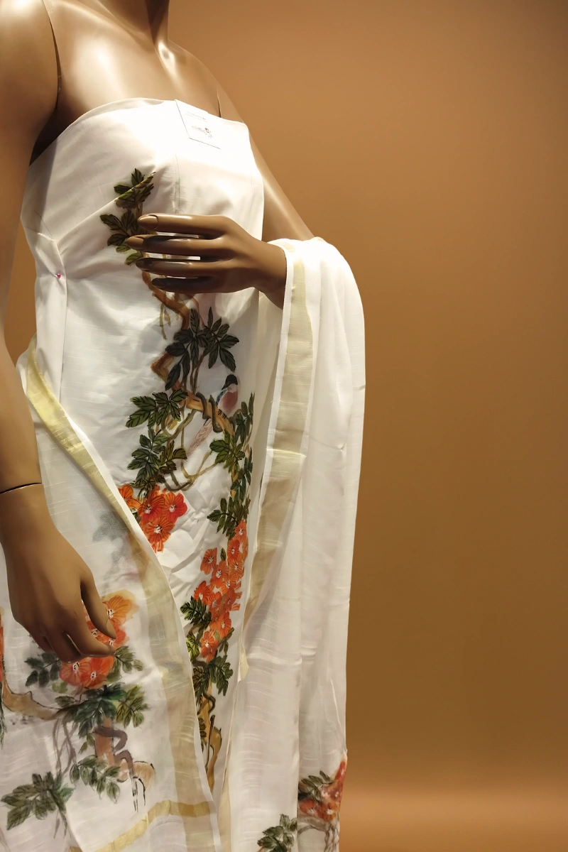 What makes this suit truly special is the hand-painted floral artwork. No prints or machines — just the skilled hands of artisans who bring each piece to life with individually brushed motifs. The subtle variations in design reflect its authentic handmade charm.