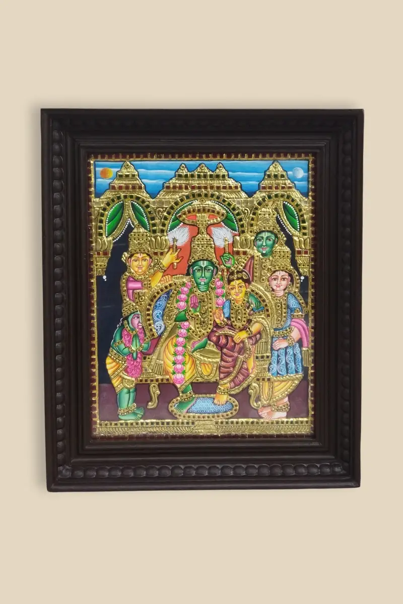 Crafted on a seasoned anti-termite wooden board and Vagai wood frame using traditional Thanjavur painting techniques