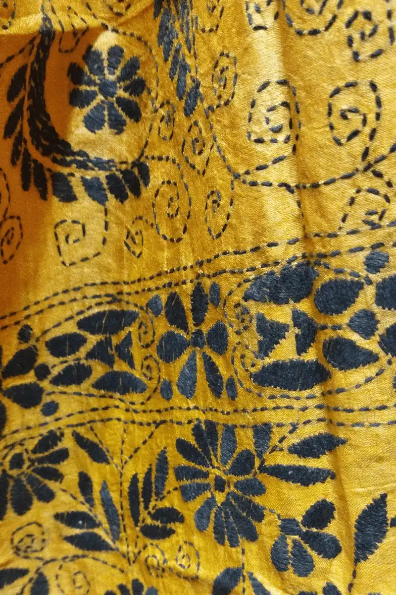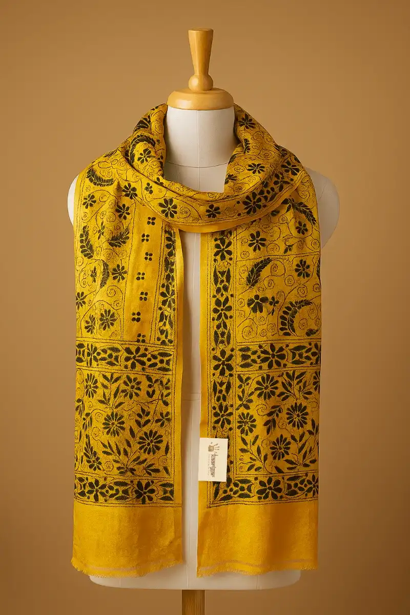 Every stole becomes a canvas for Bengal’s legendary Nakshi Kantha embroidery. Using fine needlework, karigars trace motifs inspired by nature, folklore, and everyday life. The patterns are created entirely by hand, each stitch revealing depth and narrative. This kantha stitch stole carries countless hours of dedication, transforming luxurious silk into a piece of living art.