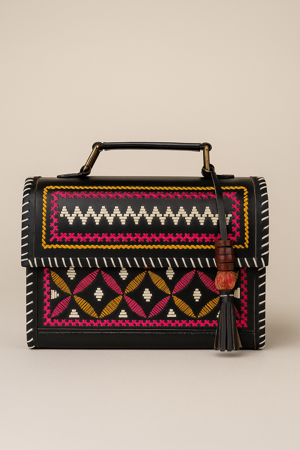 Every women handbag in our collection tells a story. This leather sling bag for women masterpiece showcases bold geometric motifs hand-embroidered by skilled Rabari artisans, not machines. The intricate pink, mustard, and ivory threadwork creates striking contrast against premium black leather, making this women leather bag both timeless and eye-catching.